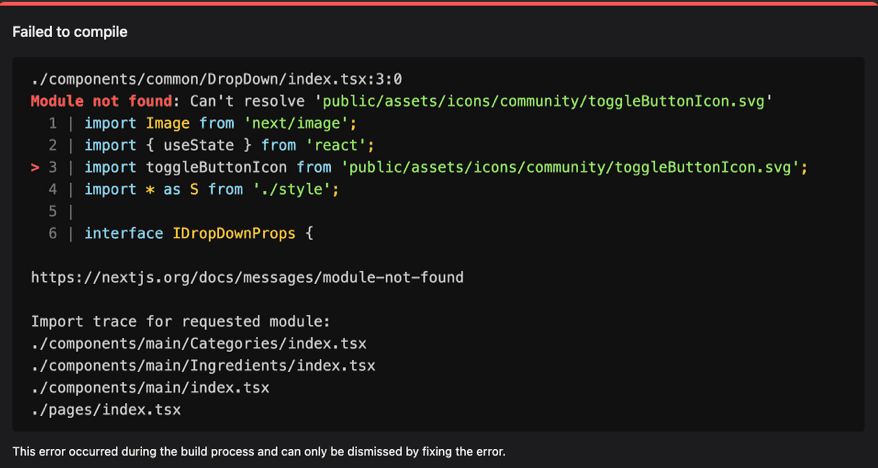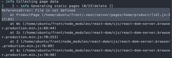 일단 type 에러 나는 모든 부분을 수정해 주었다. 그런 다음 다시 build를 진행해 보았다. 그러자 또 새로운 에러가 발생하였다,,😧