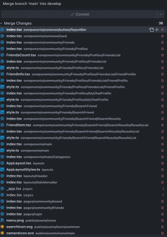 그런데 도대체 도대체 왜 이따구로 충돌이 나는지 모르겠다. icon이나 저런 코드들 다 필요한 것들인데, delete 된 걸로 merge가 되려고 하는 것이다. 🤯 몇 시간 째 이거 붙잡고 끙끙 거리고 있는데, 아오 이거 왜 이러는 거지,, 서터레스로 병 걸릴 거 같다,,, (시름시름)