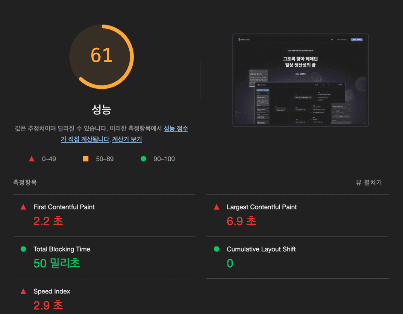 성능 총점은 61점이고, 10.1MB의 리소스가 모두 렌더링 되었을 시 405ms가 소요 되었다.