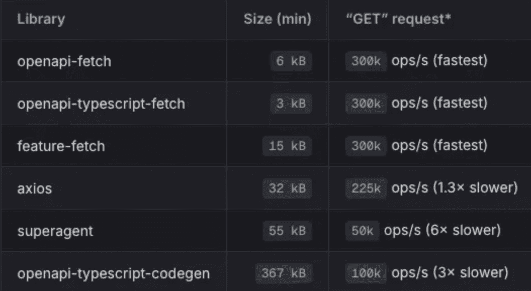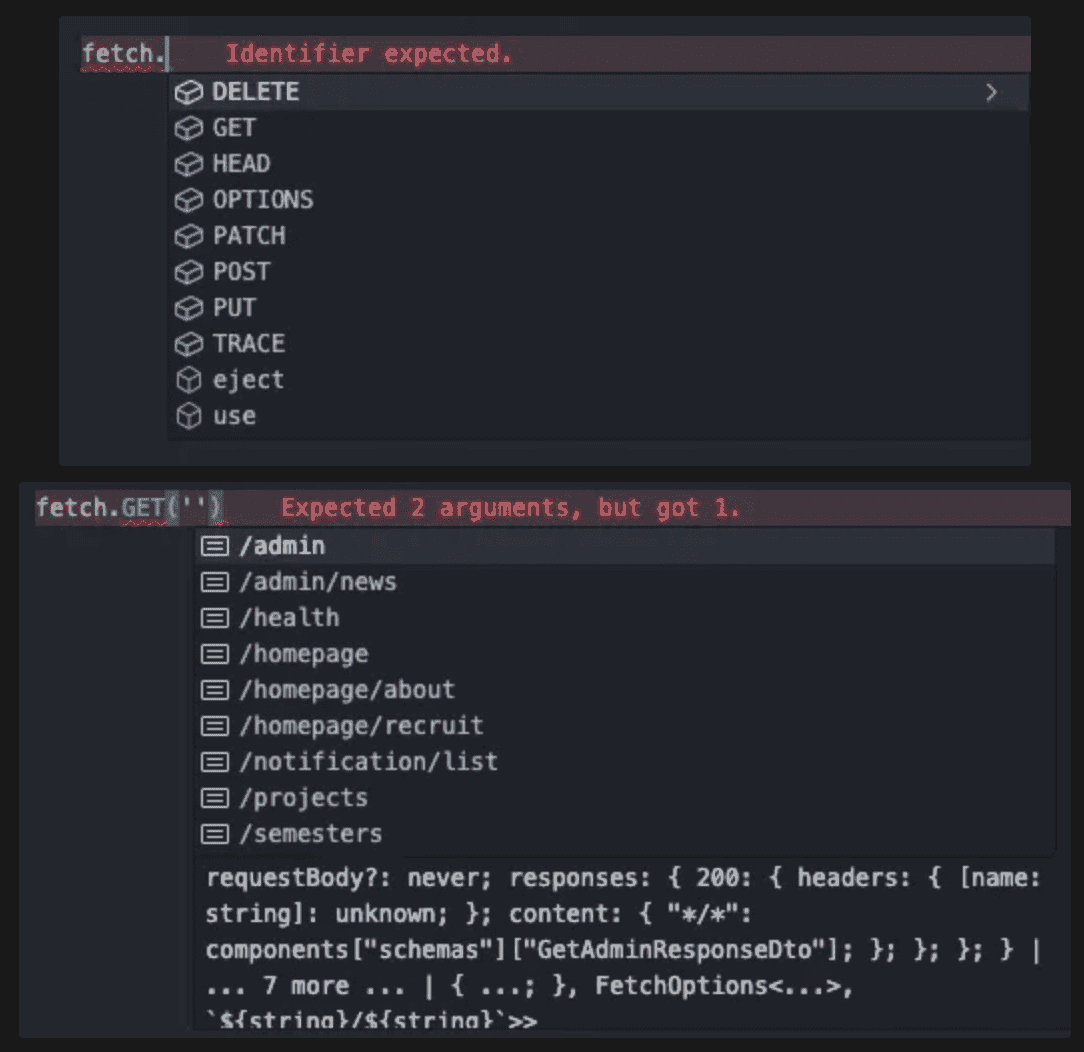 해당 interface를 fetch에 넣어줘야 한다. 이 역시도 이미 라이브러리가 구현되어 있어 이를 이용해주기로 하였다. 여러 라이브러리가 있었는데 이 중 번들 사이즈도 작으면서 빠르고 weekly 다운 수도 많은 openapi-fetch를 이용해주기로 하였다. openapi-typescript-fetch와 openapi-react-query는 사용법이 다소 직관적이지 않아 추가로 해당 라이브러리의 사용법을 익혀야 했기에 제외 시켰다.