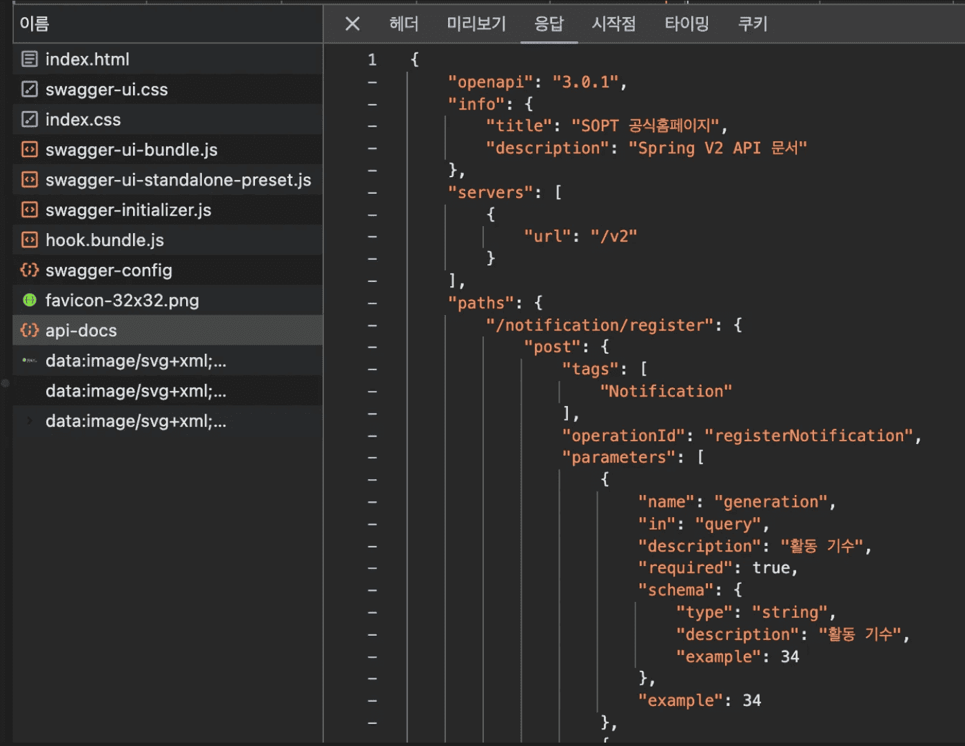 api-docs라는 요청의 응답으로 OpenAPI Spec이 들어있음을 확인할 수 있었다.