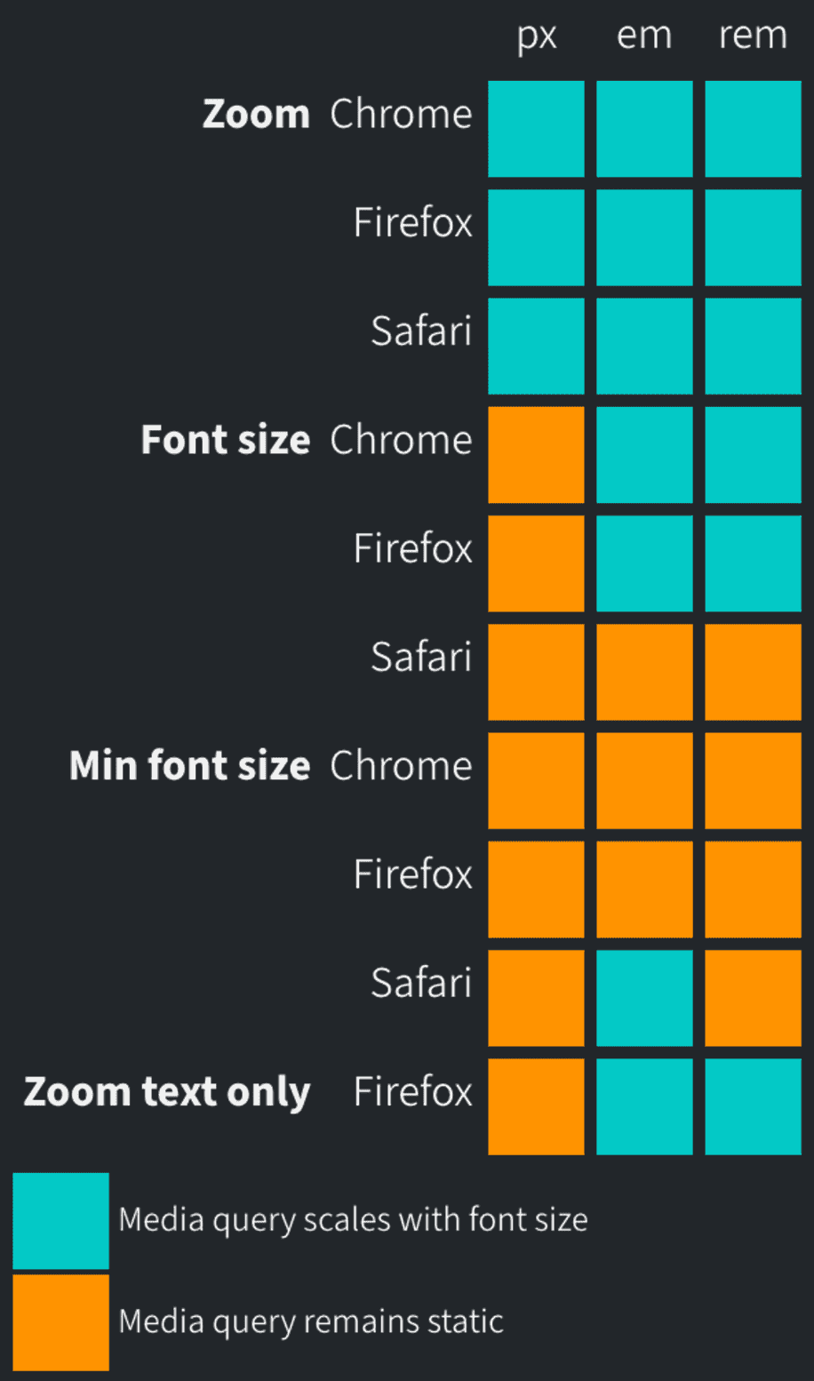 정답은 없다. 사용자의 font size에 맞게 breakpoint가 같이 조절되게 하고 싶다면 em이나 rem을 사용하면 된다. (Safari 제외.) 과거에는 rem을 사용했을 때, 에러가 있었지만 현재는 개선이 된 것으로 파악이 된다. (Safari에서의 minimum font size 경우 제외.)