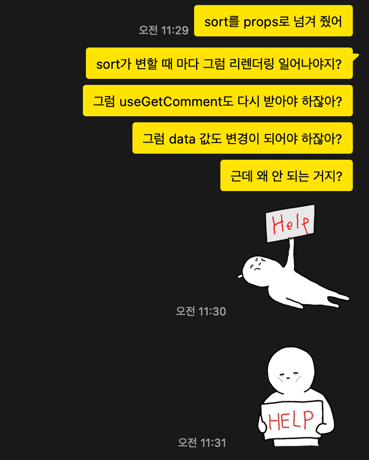 이것도 생각보다 시간이 좀 걸렸다. 처음에는 아 이거 서버 쪽 문제 아니야? 생각을 했었다. 안 되면 일단 난 잘못 없고 서버를 의심하는 병에 걸림. 구글링을 해도 잘 모르겠어 가지고 react query 버리고 그냥 axios로 해보았다. 진짜 서버 문제가 아닐까? 싶어서 말이다. 헹,, 근데 너무 잘 되고,, 내 쪽의 문제인데 도대체 왜 안 되는지 이유를 모르겠어 가지고 혜인이한테 sos 요청을 보냈다.