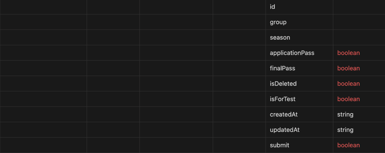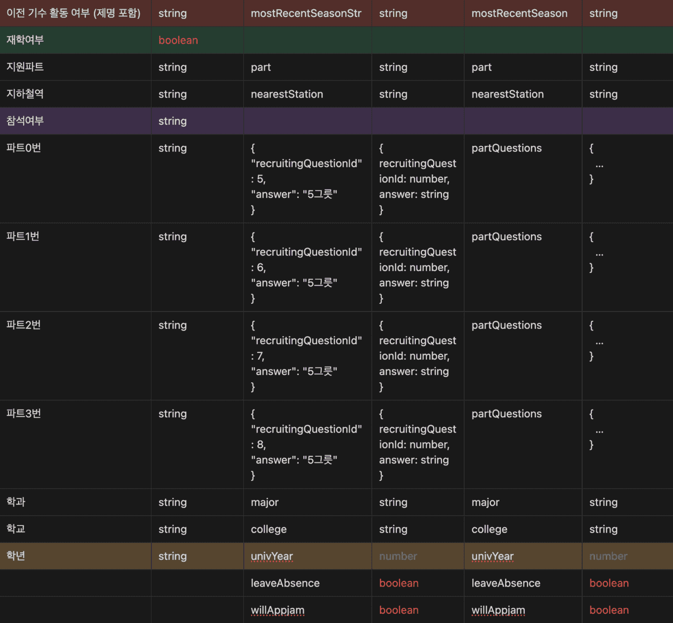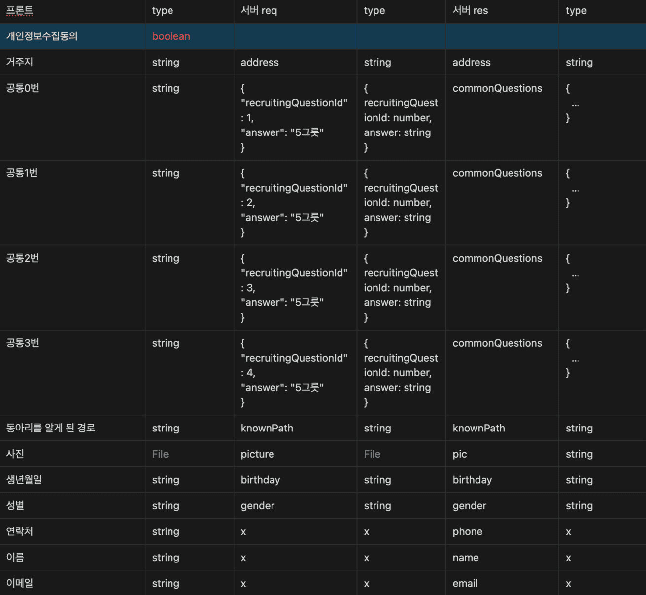 일단 서버와 프론트에서 사용되는 변수명과 타입을 전부 파악해 보았다. 이 중 수정이 필요한 부분에 대해 색깔 표시를 하였다.