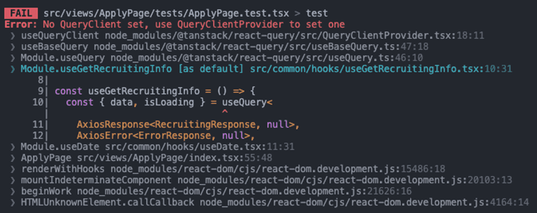 custom render에는 query client가 설정 되어있지 않아 useQuery를 사용할 수 없다는 에러였다.