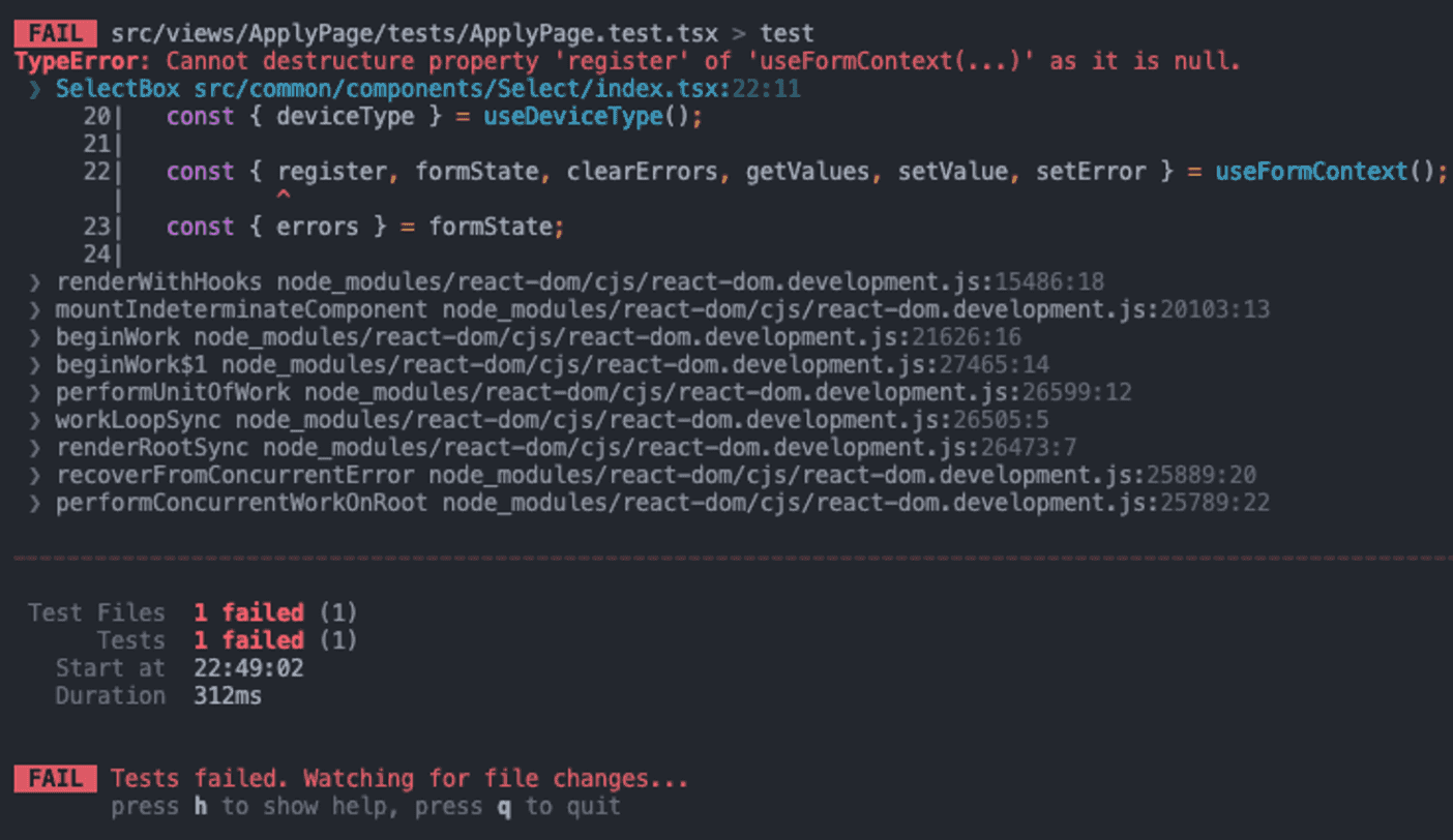 react-hook-form의 FormProvider와 useFormContext를 이용하여 method를 전달해주고 있었는데 custom render에는 FormProvider를 찾을 수 없다는 에러였다.